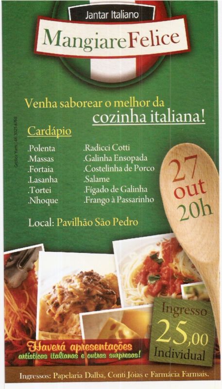 Neste ano será no Pavilhão São Pedro,com ambiente decorado,apresentações artísticas e o melhor sabor da cozinha Italiana.Venha participar! Traga a sua família e os seus amigos!